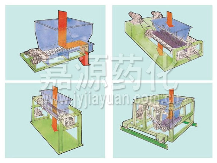 ◎輥式造粒機: 由加料斗、二根輥子和振動網構成。以增大物料面積為目的的制粒機。物料與振動網接觸,通過輥子左右往返運動強制將物料擠入網中,形成圓狀形的顆粒。